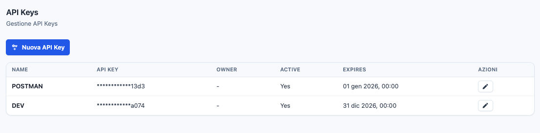 La sezione API Key permette di creare, modificare e revocare chiavi per accesso programmatico alle API.