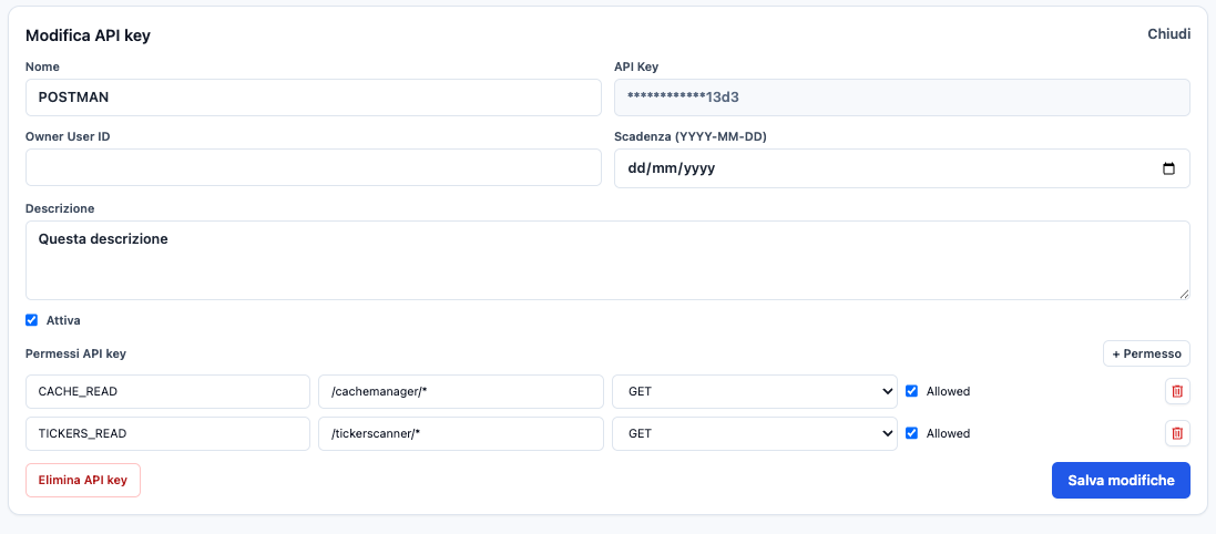 Modifica API key e permessi